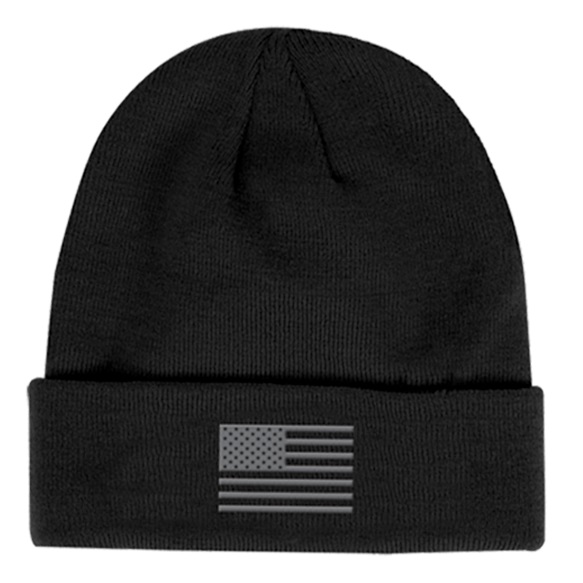 Winter Knit Beanie American Flag Logo Olive Green with Black Flag